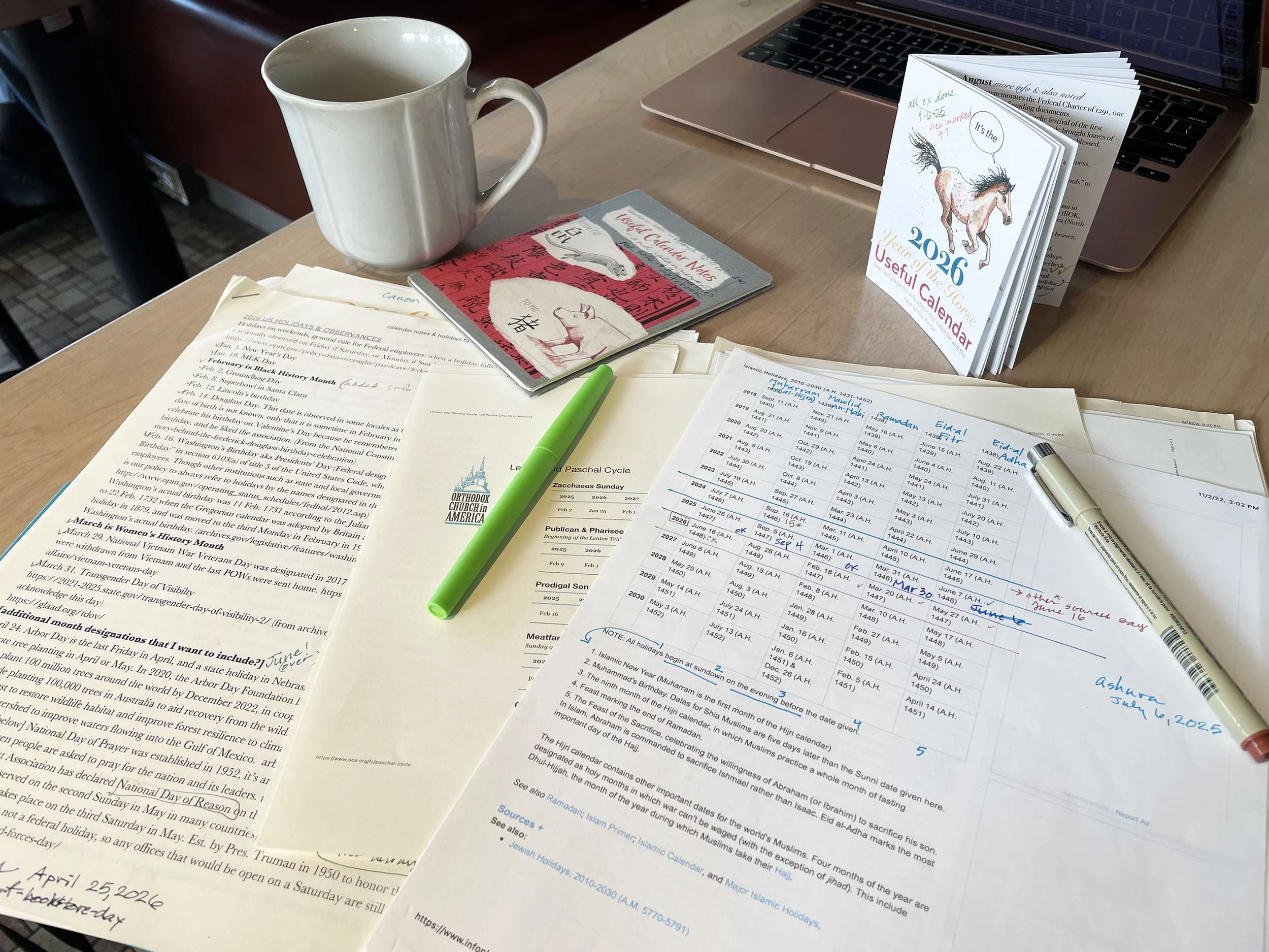 Having the calendar “done”—that is, ready for printng—is a big deal to me because creating it is a much more involved and research-heavy process than you might expect for a mere calendar. That’s because it’s not really just a calendar; it’s kind of an almanac, loaded with holidays and observances from many religions and countries, plus a little background information about many of them, and about the featured animal.