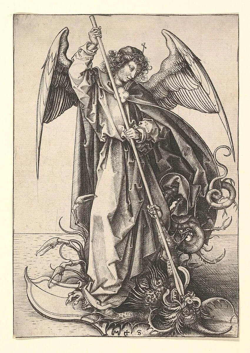 St. Michael, an engraving by German artist Martin Schongauer, ca 1470–1491. From the Metropolitan Museum of Art.