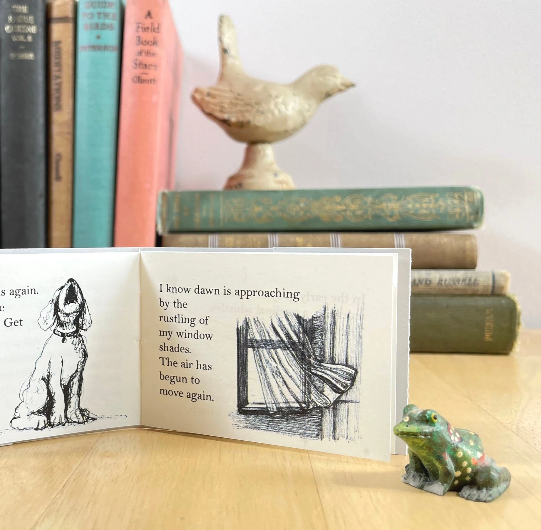This mini zine came about from my listening to nature sounds mingled with other city noises (the first bus of morning, a dog barking) when lying awake on a summer night. It's an essay about the zen of listening, and the practice of tuning in to the quiet things that can get lost in the bustle and noise of the daytime.