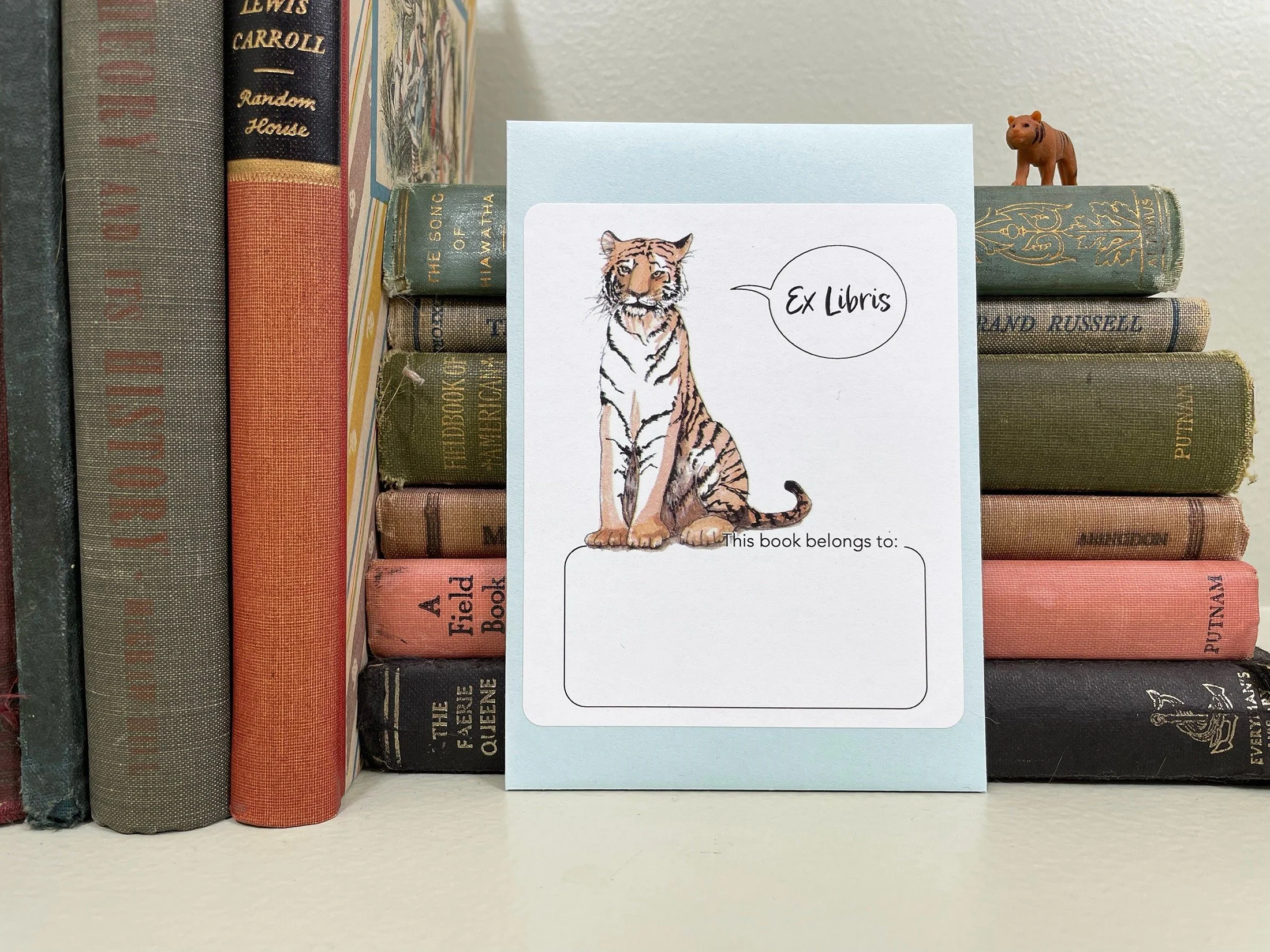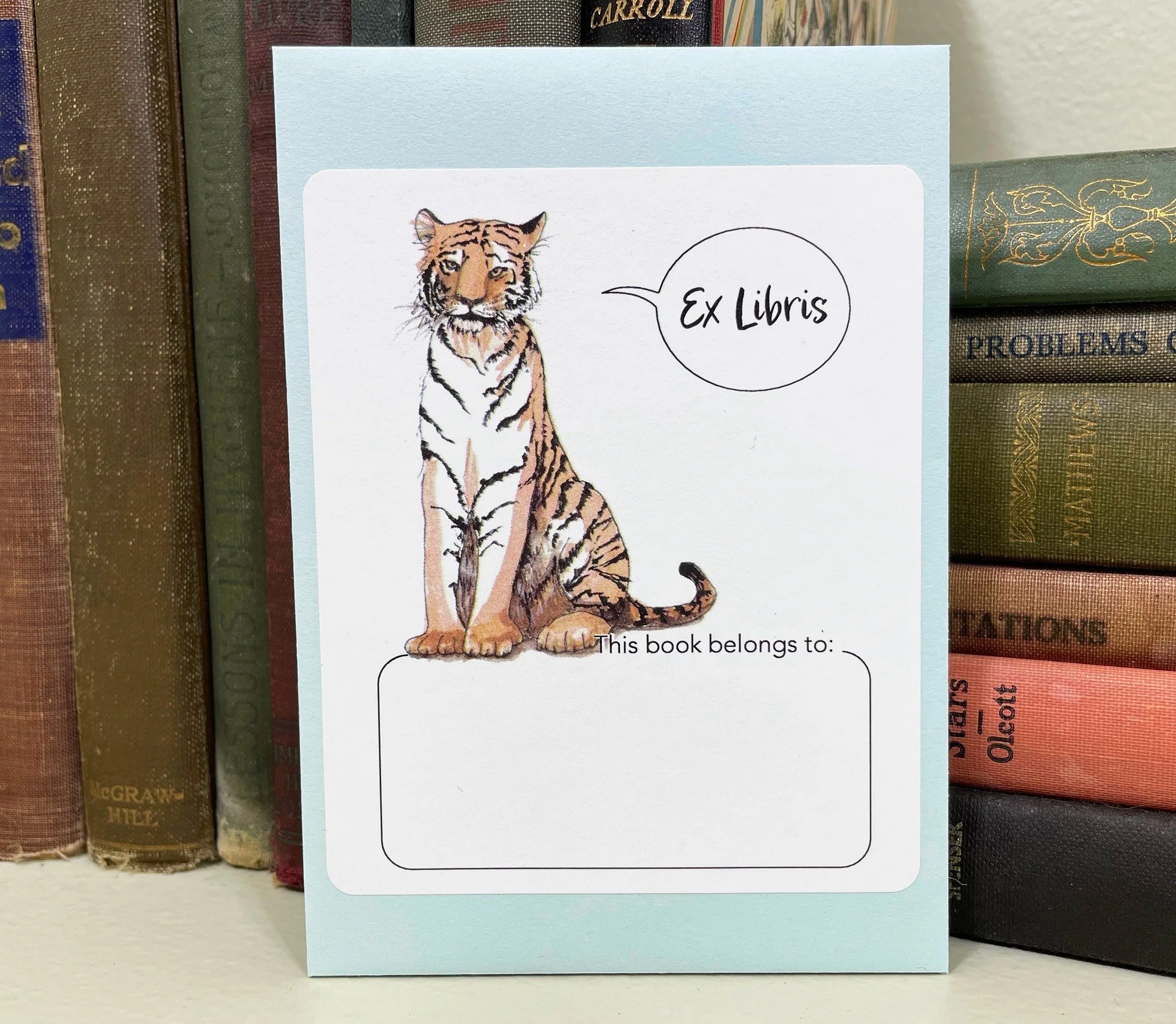 Friendly tiger bookplate stickers. Sitting tiger says "Ex Libris" or "My Book!" Set of 18. Blank or personalized.